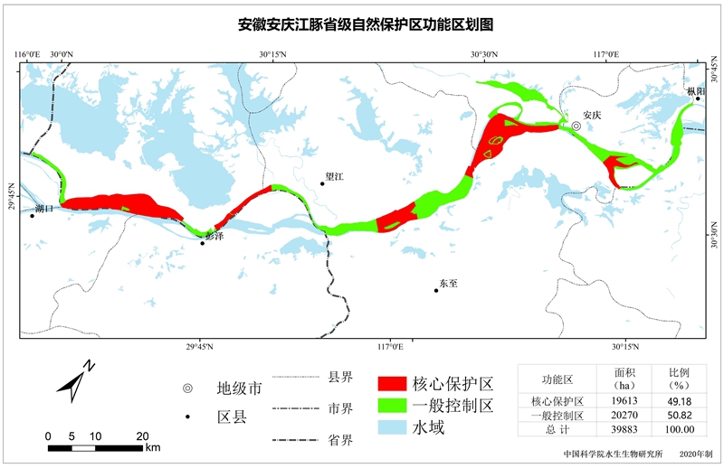 “保护区”范围包括安庆和池州江段大堤以内的水域、滩涂和沙洲等区域;皖河口至七里湖段水域和滩涂。“保护区”总面积39883公顷,其中:核心保护区面积19613公顷,一般控制区面积20270公顷。