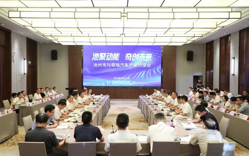 8月23日下午,池州市与奇瑞汽车产业对接会举行。市长贺东,奇瑞汽车股份有限公司常务副总裁张国忠出席会议并讲话。市委常委、常务副市长方能斌主持会议,市委常委、贵池区委书记何刚,奇瑞汽车股份有限公司副总裁王厅、总裁助理张炳凤,以及广东创世纪智能装备集团股份有限公司董事长夏军等50余家企业相关负责人参加会议。