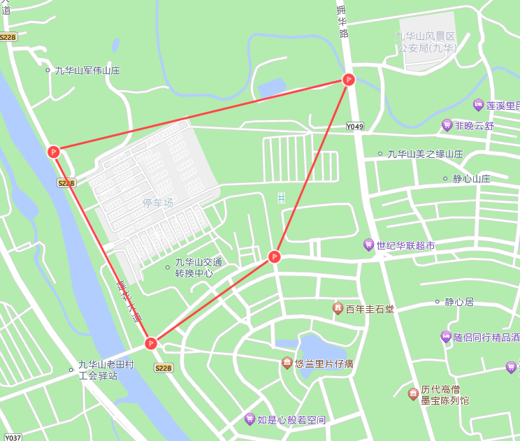 (一)游客服务中心:皖源客栈西侧15米、莲花大道与柯村北路交叉口东北侧、漫漫民宿(九华山游客服务中心店)东侧15米、中国工商银行(池州九华山支行)南侧20米四点范围内。坐标点(国家测量局02号标准,下同):