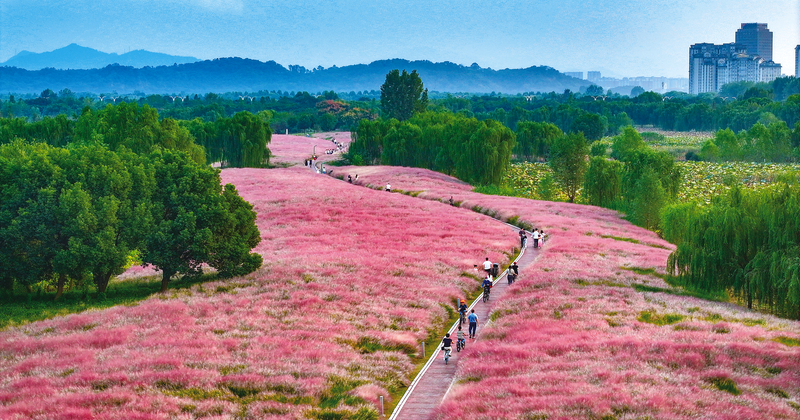 日前,平天湖生态湿地公园粉黛乱子草迎来观赏期,人们或骑行、或漫步,沉醉于这梦幻美景,拍照留念,尽情享受与自然相拥的惬意时光。