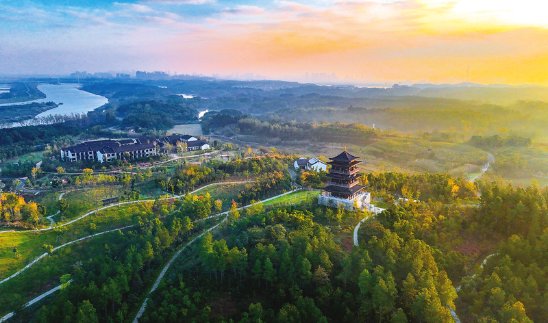 日朝阳下,杏花村文化旅游区层林尽染、色彩斑斓。古朴的塔楼矗立在林海间,蜿蜒步道镶嵌于斑斓草木边缘,远处波光粼粼的河湖与错落有致的城市天际线交相辉映,绘就出一幅诗意文旅画卷。
