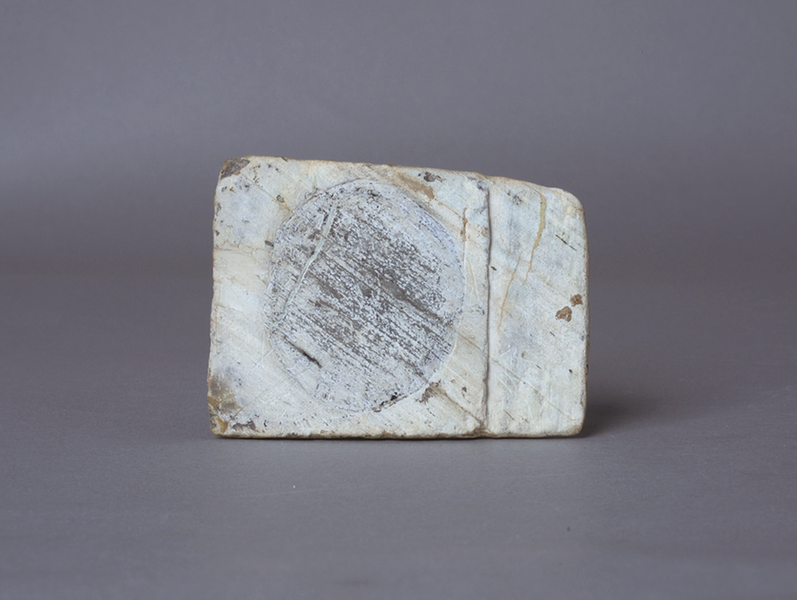 这枚石锛通长仅8.5厘米、通宽6.5厘米、重200克,青灰色石身虽无华丽光泽,却透着岁月沉淀的厚重。其最为特别的是两处匠心设计:靠近背部的器身被精心加工成整齐的二级阶梯形,将石锛清晰分成上下两段,“有段石锛”的名称便由此而来;正面阴刻的圆形符号,宛如一轮简化的太阳,在同时期相对朴素的石质工具中显得格外突出。
