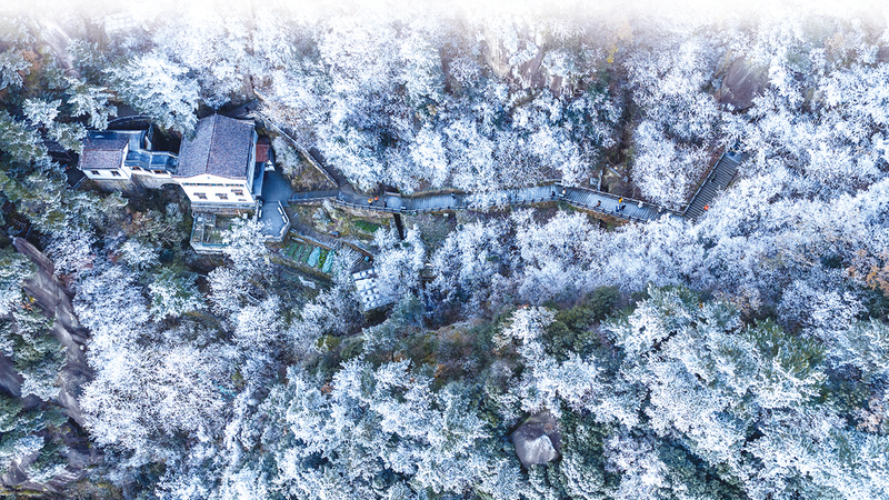受寒潮影响,11月17日夜间,九华山风景区迎来今冬首场降雪。一夜之间,原本五彩斑斓的山林银装素裹,宛如仙境,吸引不少游客次日登山,欣赏这如画般的琉璃世界。