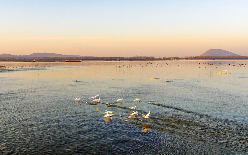 近年来,随着一系列生态修复与精准管护措施实施,长江池州段生态环境明显改善,吸引大量候鸟来此越冬。近日,在长江贵池区秋江街道段,东方白鹳等珍稀候鸟或涉水觅食,或振翅盘旋,与澄澈的江水、金黄的沙洲构成一幅美丽的生态画卷。