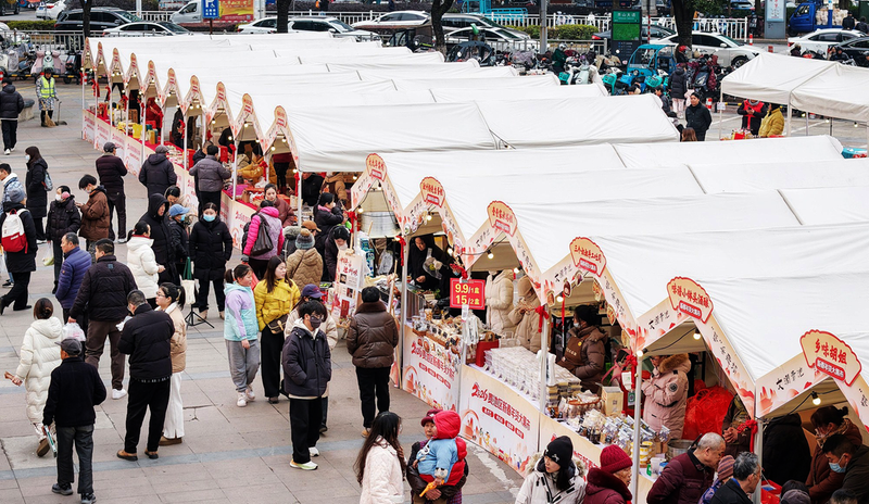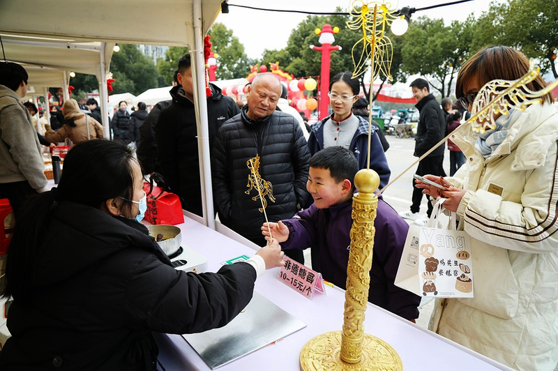 广场中间,40个展位整齐排开,各类年货琳琅满目。本土风味酱料、新鲜出炉的面食、造型精致的西点等一应俱全,满足市民一站式采购需求。“现做的吐司、蛋糕,尝尝!”陈雨晴的西点摊前围着不少人,她一边麻利地给顾客打包,一边热情介绍:“人气很旺,一上午就没闲着,能为大家的年货清单添上一份甜蜜,心里很高兴。”