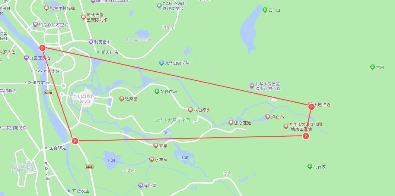 (一)游客服务中心区域。皖源客栈西侧15米、莲花大道与柯村北路交叉口东北侧、漫漫民宿(九华山游客服务中心店)东侧15米、中国工商银行(池州九华山支行)南侧20米四点范围内。坐标点(国家测量局02号标准,下同):
