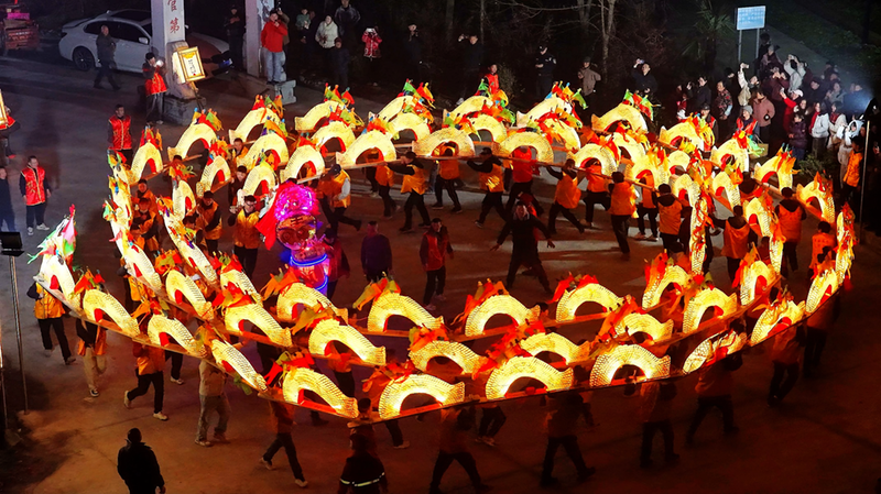大年初一,69板吴家板龙和33板施家板龙隆重起灯、热闹起舞。舞龙队除正月初三休舞外每日巡游闹春,两条巨龙在数十名队员们的默契配合下,时而昂首摆尾,时而蜿蜒盘旋。璀璨的龙灯点燃了山村的激情,引得现场村民与游客纷纷驻足,在欢呼声中感受浓浓的年味。