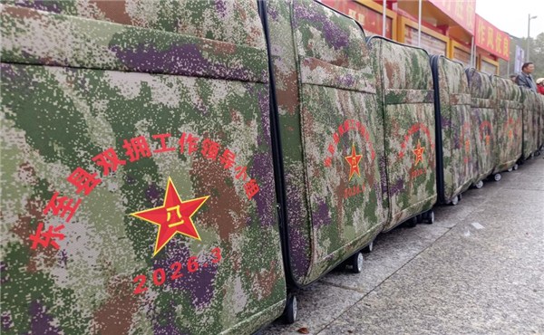 为让新兵轻装上阵、感受尊崇,东至县双拥工作领导小组办公室为每一名入伍新兵统一配发定制迷彩行李箱,将组织关怀与家乡温暖装进行囊、伴随征程。这一暖心举措,是东至县深化双拥共建、做实拥军优属的生动缩影。近年来,我县始终把双拥工作摆在重要位置,全力做好军人军属服务保障,用心用情解决后路、后院、后代问题。从军人驿站、拥军门店到双拥病房、拥军贷,从立功喜报上门到常态化走访慰问,全县上下军地同心、军民合力,营造出“一人参军、全家光荣,全社会尊崇军人”的浓厚氛围。