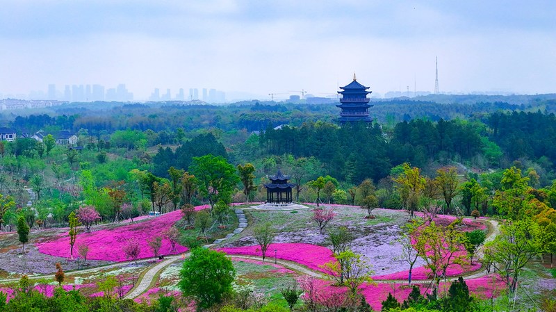 4月10日,池州杏花村文化旅游区内,大片芝樱花如期绽放。绿树掩映间,粉紫相间的花海尽情铺展,风景如画。