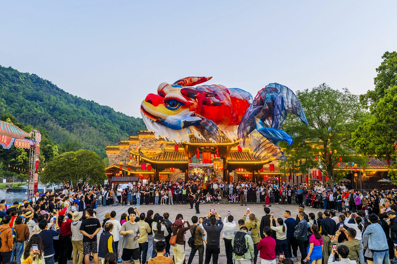 春日石台,除了古村与茶香,改造升级后的牯牛降景区趣味十足。游客服务中心内,憨态可掬的牛IP引游客驻足,文创店内非遗文创与本地农产品琳琅满目,智能机器人提供导航指引。即将亮相的山海遗珍馆,以《山海经》为根脉,运用AI、VR技术打造沉浸式体验;双龙谷景区内,1.9公里长的高空漂流滑道已建成,如银带穿梭山谷。