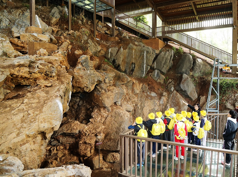 华龙洞遗址入口处,古人类狩猎雕塑前围满了好奇的孩子,他们紧跟讲解员脚步,频频抛出“为什么动物雕塑没有伤口”“古人类为什么不穿衣服”等天真疑问。作为继北京周口店遗址后,我国少有的同时包含有丰富人类化石、大量石制品及哺乳动物化石的重要古人类遗址,华龙洞是东至研学的“金字招牌”,这里的一草一木都藏着东亚智人的文明密码。