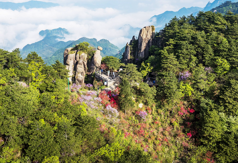 清晨,高空栈道与山巅吉祥松打卡点早已聚满游客,大家赏花海、观云海,将九华山的春日盛景定格镜头。“爬上来的疲惫全被这景色‘吹跑了’。”南京游客赵女士登顶后,被眼前的万紫千红彻底治愈。