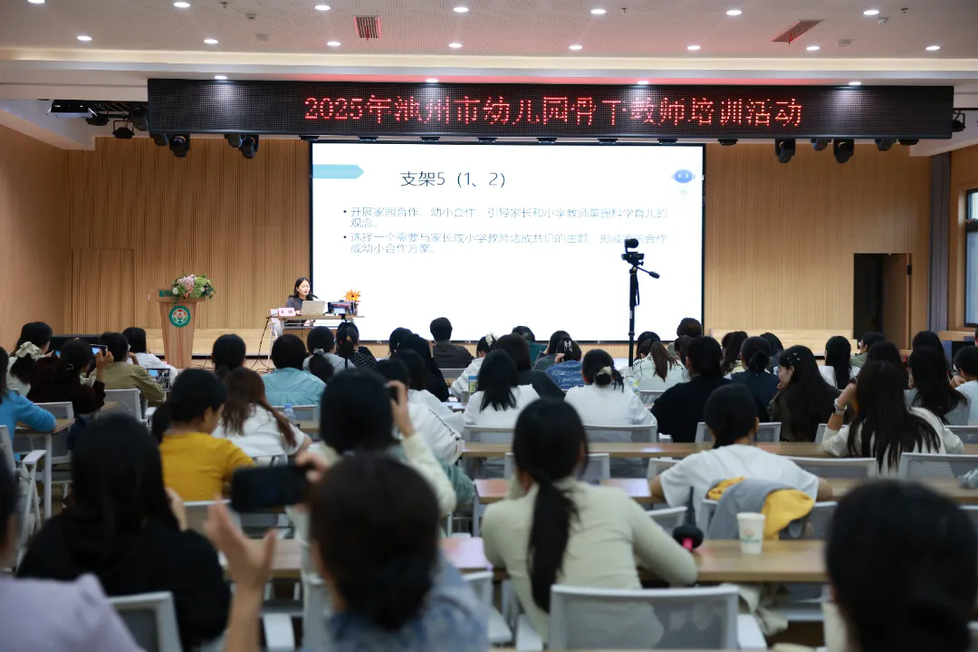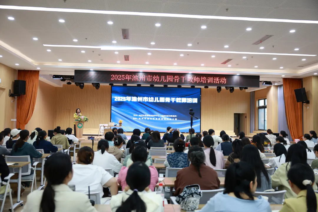 2025 年 10 月 16 日,由池州市学前教育指导中心主办、市直幼教集团杏花村幼儿园协办的2025年池州市幼儿园骨干教师培训活动,在市直幼教集团杏花村幼儿园顺利开展。活动特邀请南通大学教授、硕士生导师陶金玲,南通市教育科学研究院正高级教师、江苏省特级教师王丽开展专题讲座。市教体局学前教育教研员武慧,市直幼教集团党支部书记、主任刘志峰,集团专职副书记纪忠玲,市学前教育指导中心副主任程春玲出席活动,全市幼教教研员、骨干教师等 180 余人参加活动。