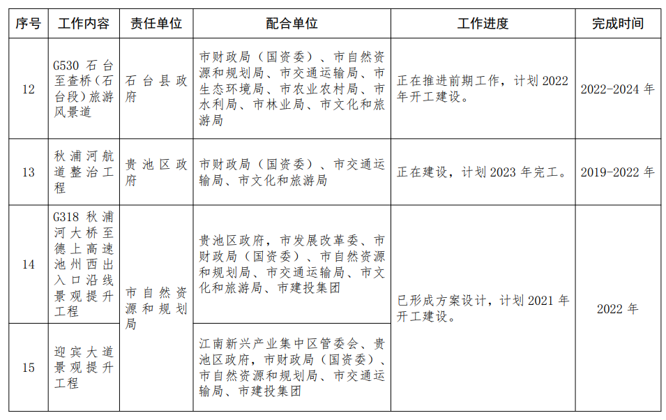 6.创建交旅融合“一县一品”。支持各地通过聚焦区域内交通和旅游发展特色优势资源,集中力量紧扣亮点建设一批交通基础设施和服务设施,全面提升交通服务和旅游体验水平,完成《池州市全域旅游风景道体系规划》编制。围绕“一池山水·千载诗城”,推进G318国民公路建设,完成G318秋浦河大桥至德上高速池州西出入口、迎宾大道沿线景观风貌提升,桃坡至栗坑旅游风景道创建2021年“安徽省品质示范路”;围绕“尧舜东至·山水升金”,完成东至县尧渡河绿道项目;依托“神奇九华·灵秀青阳”,完成青通河(芙蓉大道-朱备镇段)沿线环境整治及休闲绿道工程项目;围绕“原生态最美山乡”,实施丁香至库山、白石岭旅游风景道项目;改造提升沿线道路景观,设立驿站,完善停车场、房车营地、充电桩、游步道等基础设施。〔责任单位:各县区政府,江南新兴产业集中区、九华山风景区、开发区管委会,市发展改革委、市财政局(国资委)、市自然资源和规划局、市交通运输局、市生态环境局、市林业局、市水利局、市文化和旅游局、市建投集团按职责分工负责〕