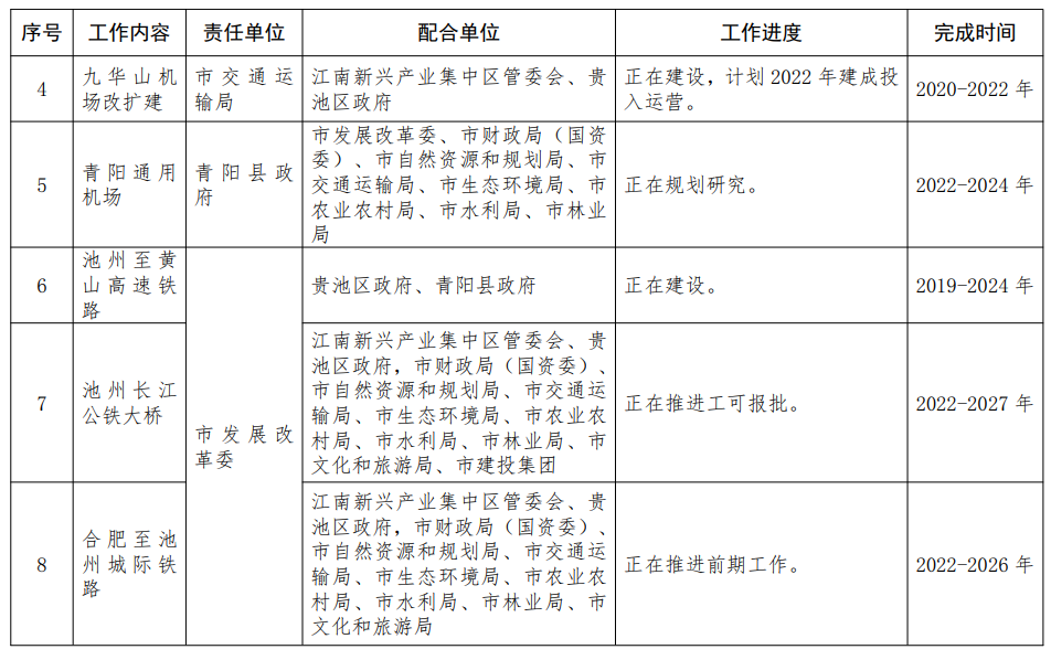 1.建设“五山”联动“快进”交通网。依托轨道交通、高速公路、民航等构建“快进”交通网络,提高旅游目的地的通达性和便捷性,实施G3W德上高速池州段,谋划建设池州至宣城、青阳经石台至东至高速公路;实施池州至黄山高速铁路建设,加快推进池州长江公铁大桥、合肥至池州城际前期工作;实施九华山机场改扩建,加快推进青阳通用机场前期工作,完善皖南地区“快进”旅游交通基础设施网络。〔责任单位:各县区政府,江南新兴产业集中区、九华山风景区管委会,市发展改革委、市财政局(国资委)、市自然资源和规划局、市生态环境局、市交通运输局、市农业农村局、市水利局、市林业局、市建投集团按职责分工负责〕