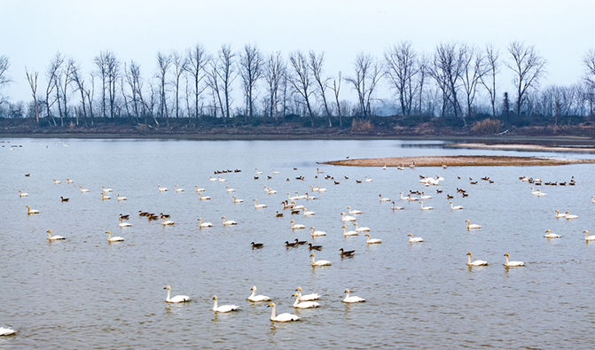 1月2日,贵池区十八索自然保护区,东方白鹳、小天鹅、白琵鹭、白额雁等候鸟在滩涂湿地栖息、觅食。十八索自然保护区湿地生态环境优越,每年都会吸引数万只候鸟在此停歇越冬。随着气温持续降低,珍稀候鸟成群结队翩然而至,万鸟翔集的壮观场景再次上演,整个湿地进入了最佳观鸟期。