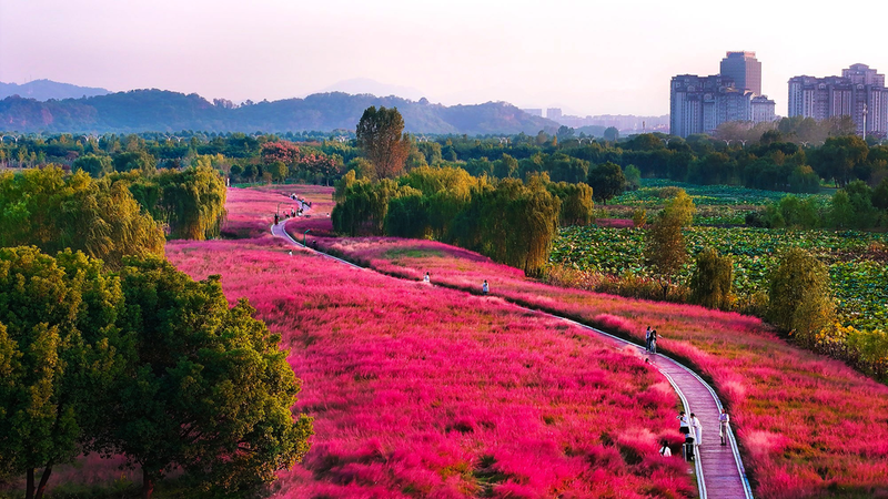 近日,位于主城区平天湖生态湿地公园的3万平方米粉黛乱子草花海,迎着舒暖的秋风进入最佳观赏期,吸引大批市民拍照打卡,感受金秋暖阳映照下的“粉色浪漫”。 记者 张延鹤 吴骏 摄