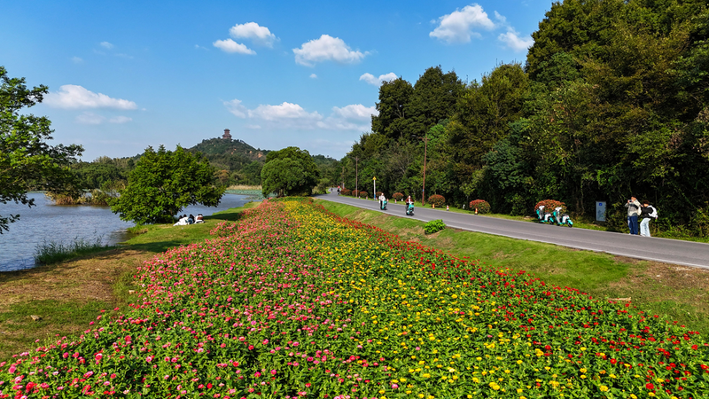 金秋时节,平天湖畔五彩斑斓的花朵竞相绽放,花海与青山、绿水、亭台、楼阁相映成趣,构成一幅美丽的秋日画卷。众多市民和游客或漫步赏花,或临水休憩,尽享美好时光。