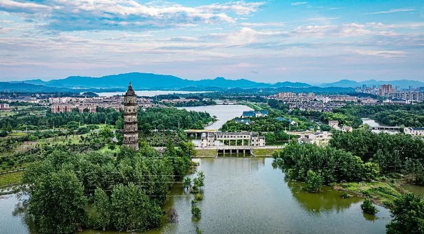 清溪塔影照行舟,前辈遗风立渚州。十九年功非一篑,七层砖石系千秋。昔年仗节开基处,此刻摩云迎日头。敬爱古贤栽此笔,客来崇仰洗灵眸。