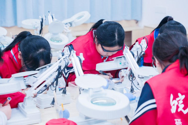 图为学生在华龙洞遗址陈列馆体验化石清理项目。