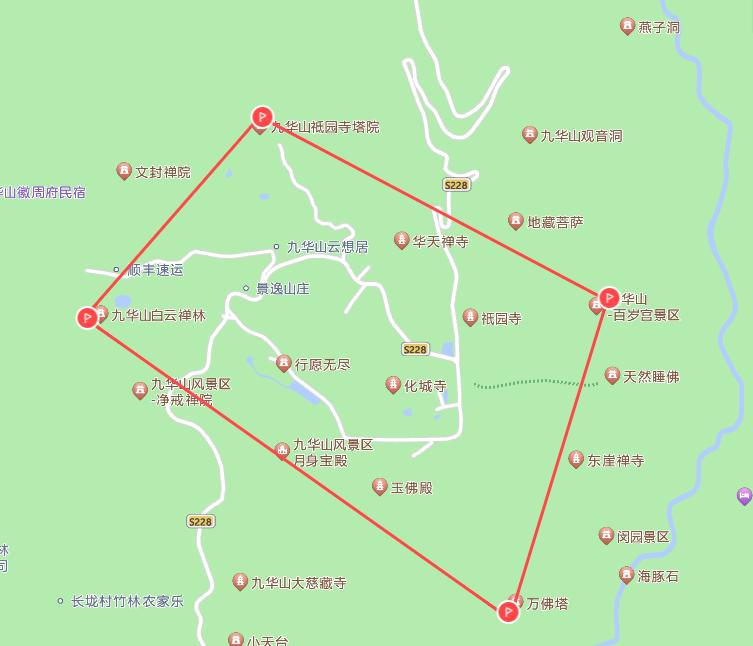 (三)九华山风景区核心景区。九华山白云禅林西侧20米、祇园寺塔院北侧、百岁宫景区东侧、万佛塔南侧四点范围内。坐标点: