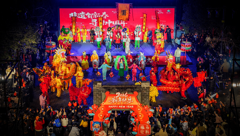 晚上7点,民俗展演准时上演。演出共分为“傩音传福、故园承福、烟火映福”三大篇章,开篇《马灯迎春》《双龙共舞》《石台舞狮》等非遗民俗表演接连登场,精彩演绎瞬间点燃了现场气氛;《金狮呈祥》《高跷马》等经典傩舞随后惊艳亮相,赢得现场观众阵阵喝彩;青阳新河龙船调、池州民歌联唱唱出独特的乡情韵味,唤醒每个人心底不变的年味记忆。“《高跷马》的表演太深入人心了,演员们踩着高跷还能做出各种花式动作,台上一分钟、台下十年功,让我感受到了文化传承的力量。”南京游客邵锋说。