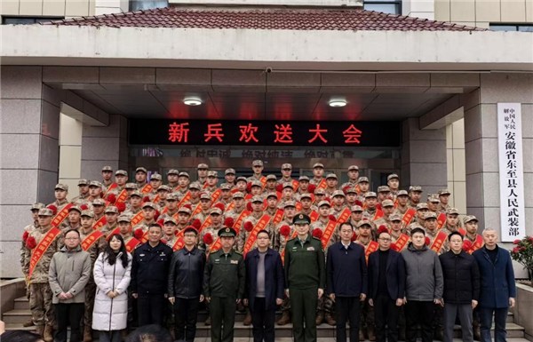 欢送大会在雄壮的国歌声中拉开帷幕。身披光荣绶带新兵们精神抖擞、意气风发,展现出东至青年投身强军事业的昂扬风貌。新兵代表、家长代表先后发言,表达了献身国防、建功军营的坚定决心,以及对党委政府与家乡人民的衷心感谢。