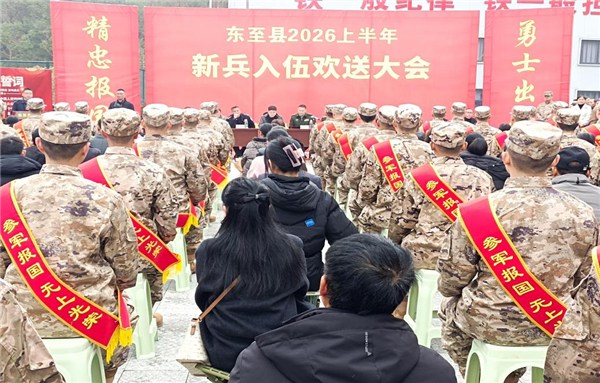 春风送暖,军歌嘹亮。3月16日上午,东至县隆重举行2026年上半年新兵入伍欢送大会,为即将奔赴军营、报效祖国的优秀青年壮行。县领导、县双拥工作领导小组成员单位负责人、新兵家属及社会各界代表参加活动,共同见证光荣时刻,传递东至拥军优属的深厚情谊。