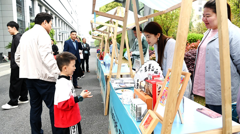 合肥市民在中国邮政安徽分公司门口搭建的石台文旅推介展台前参观。