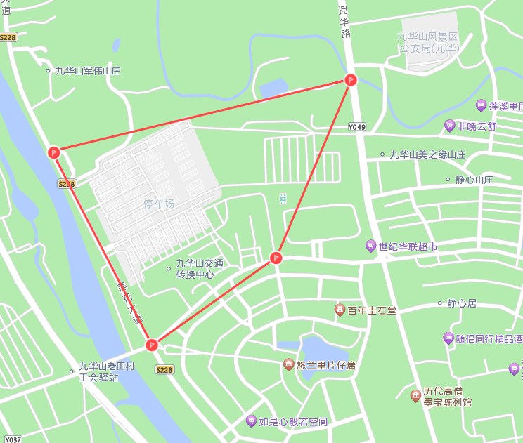 (一)游客服务中心区域。皖源客栈西侧15米、莲花大道与柯村北路交叉口东北侧、漫漫民宿(九华山游客服务中心店)东侧15米、中国工商银行(池州九华山支行)南侧20米四点范围内。坐标点(国家测量局02号标准,下同):