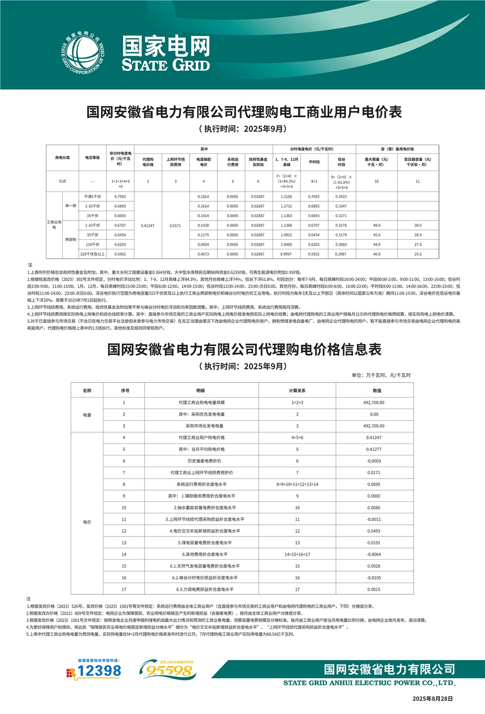 国网安徽省电力有限公司2025年9月代理购电价格信息表