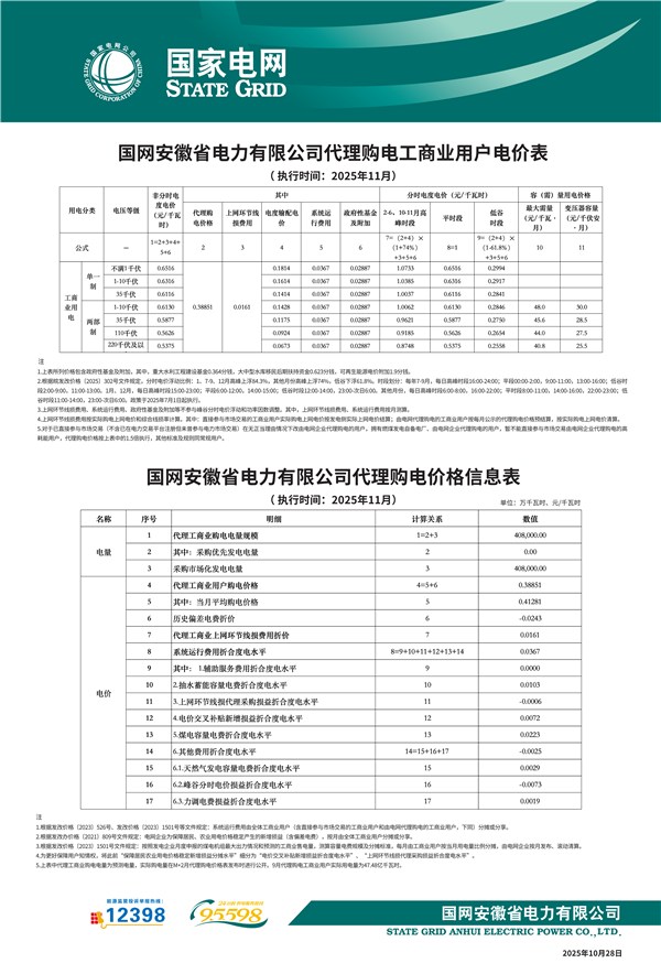 国网安徽省电力有限公司2025年11月代理购电价格信息表