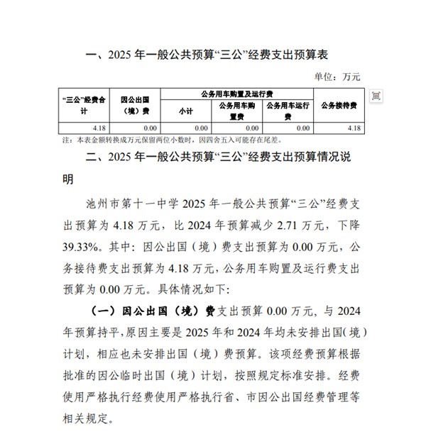 池州市第十一中学 2025 年一般公共预算“三公”经费预算