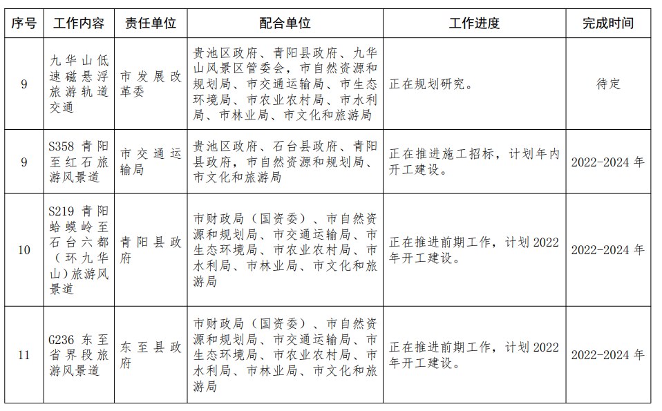 2.完善区域“慢游”交通基础网络。建设集“吃住行游购娱”于一体的“慢游”交通网络。围绕“以九华山为龙头、多板块协同”旅游格局,加快推进S358青阳至红石、S219青阳蛤蟆岭至石台六都(环九华山)、G236东至省界段和G530石台至查桥(石台段)等旅游风景道建设,打造具有皖南文化特色的生态旅游目的地。〔责任单位:各县区政府,九华山风景区、开发区管委会,市发展改革委、市财政局(国资委)、市自然资源和规划局、市生态环境局、市交通运输局、市农业农村局、市水利局、市林业局、市文化和旅游局按职责分工负责〕
