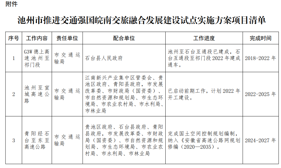 附件:池州市推进交通强国皖南交旅融合发展建设试点实施方案项目清单