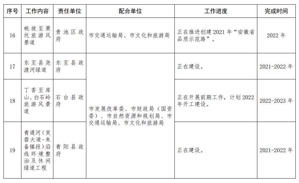 6.创建交旅融合“一县一品”。支持各地通过聚焦区域内交通和旅游发展特色优势资源,集中力量紧扣亮点建设一批交通基础设施和服务设施,全面提升交通服务和旅游体验水平,完成《池州市全域旅游风景道体系规划》编制。围绕“一池山水·千载诗城”,推进G318国民公路建设,完成G318秋浦河大桥至德上高速池州西出入口、迎宾大道沿线景观风貌提升,桃坡至栗坑旅游风景道创建2021年“安徽省品质示范路”;围绕“尧舜东至·山水升金”,完成东至县尧渡河绿道项目;依托“神奇九华·灵秀青阳”,完成青通河(芙蓉大道-朱备镇段)沿线环境整治及休闲绿道工程项目;围绕“原生态最美山乡”,实施丁香至库山、白石岭旅游风景道项目;改造提升沿线道路景观,设立驿站,完善停车场、房车营地、充电桩、游步道等基础设施。〔责任单位:各县区政府,江南新兴产业集中区、九华山风景区、开发区管委会,市发展改革委、市财政局(国资委)、市自然资源和规划局、市交通运输局、市生态环境局、市林业局、市水利局、市文化和旅游局、市建投集团按职责分工负责〕